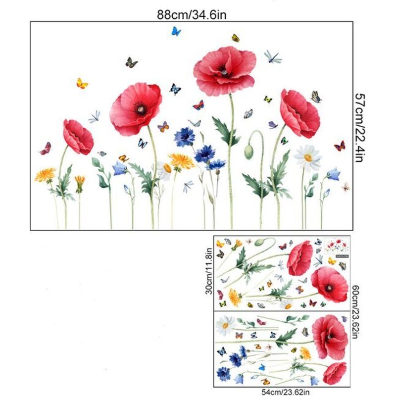 – Sticker mural coquelicot rouge – Décoration murale amovible et imperméable – Pour murs, fenêtres, meubles – Stickers colorés faciles à poser