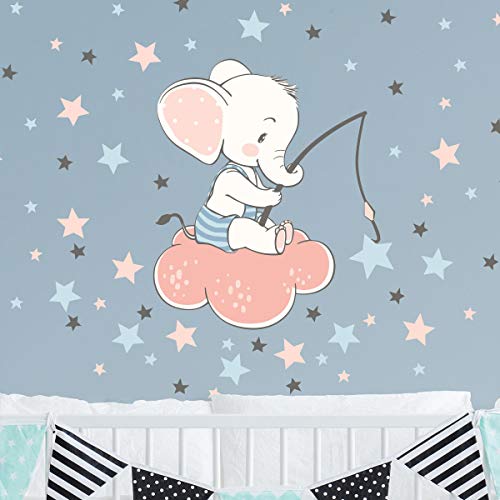 Stickers muraux enfants - Decoration chambre bébé - Stickers muraux enfant - Sticker mural Eléphant sur Nuage + 110 étoiles - Autocollant mural garçon - H35x L30 cm