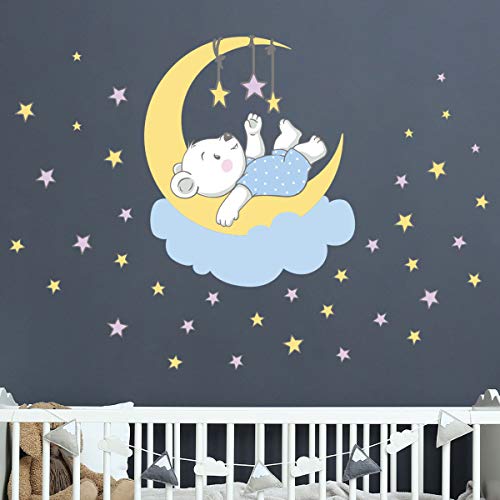 Stickers muraux enfants - Decoration chambre bébé - Stickers muraux enfant - Sticker mural Ourson sur Lune + 100 étoiles - Autocollant mural garçon - H30x L30 cm