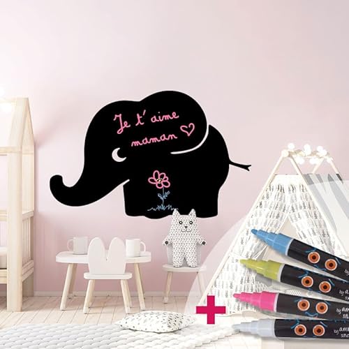 Ambiance Sticker Ardoise Tableau Noir - Stickers Muraux Adhésif Effaçable - Bébé Éléphant - H55 x L85 cm + 4 Craies Liquides