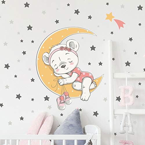 Stickers muraux enfants - Decoration chambre bébé - Stickers muraux enfant - Sticker mural Oursonne sur Lune + 100 étoiles - Autocollant mural Fille - H40x L30 cm