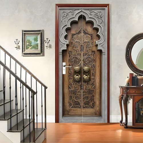 Auto-Adhésif 3D Stickers Porte Porte en bois avec arche Poster de Porte 77x200 cm Sculpture médiévale Autocollants de Décoration pour Intérieure Bureau Chambre à Coucher Salon Art Papier Peint
