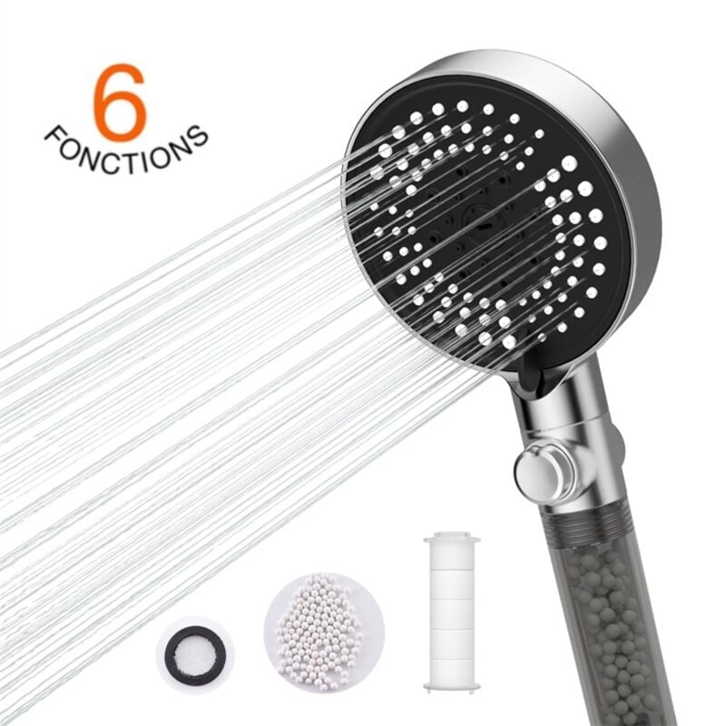 Detbom - Douchette à Main 6 Jets au Choix Pommeau de Douche Chromé avec Bouton Stop Douchette avec Anti Calcaire Filtrant et Coton pp Remplaçabl