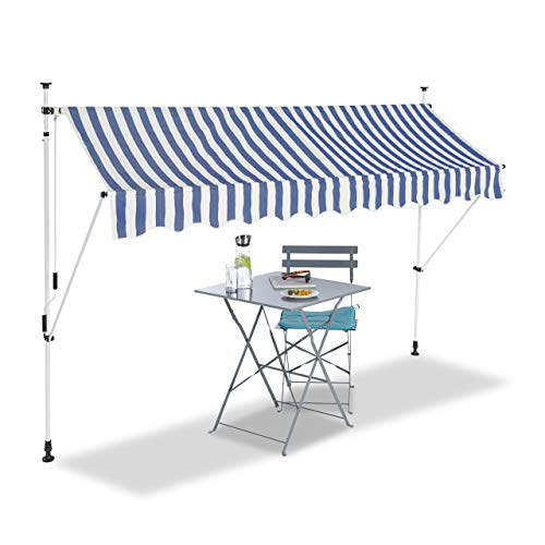Relaxdays, bleu-blanc Auvent rétractable 300 cm Store balcon marquise soleil terrasse hauteur réglable sans perçage, 300 x 120 cm
