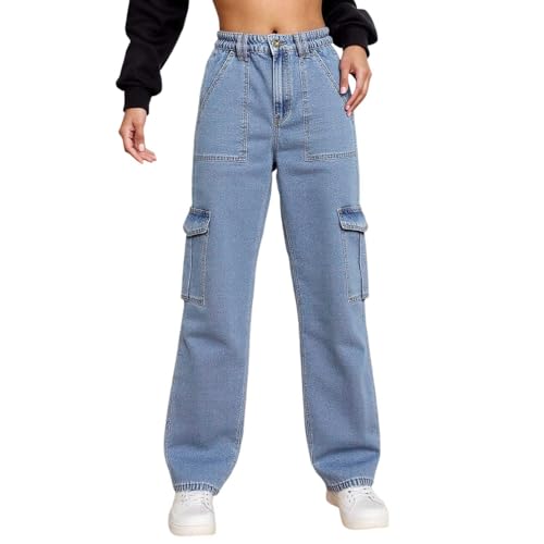 Straight Jean Femme - Jean cargo taille haute pour femme coupe droite et large pour une tenue décontractée streetwear soirée ou club avec fermeture éclair et bouton sur le devant (Light Blue S)