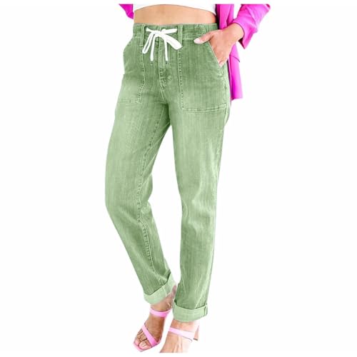 Générique Pantalon Été Femme - Straight Jean Femme Femmes Décontracté Mode Sangle Fermeture Éclair Jeans Demi-Taille Élastique Décontracté Poche Droite Denim Pantalon (Green M)