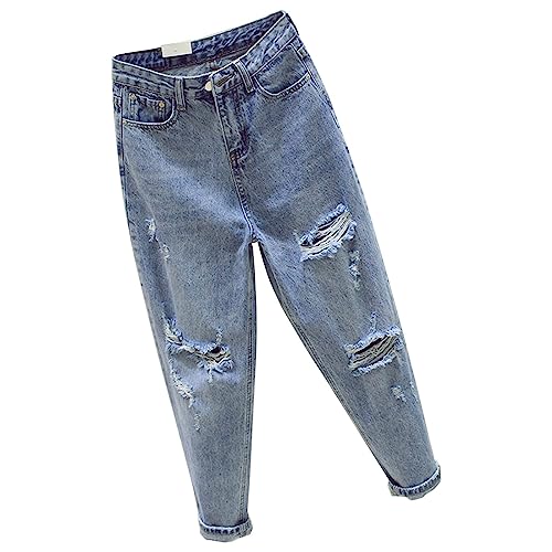 Générique Jean Femme - Straight Jean Femme Femmes décontracté Mode déchiré Trous Vieux Bande élastique Poche Taille Haute Jean Court (Blue XXL)