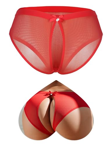comeondear Slip Ouvert Sexy Femme Culotte Fendue String Grande Taille Tanga Mesh Slips Bresilien Respirante Doublure Coton sous-Vêtement Féminins Underwear Lingerie Rouge,M