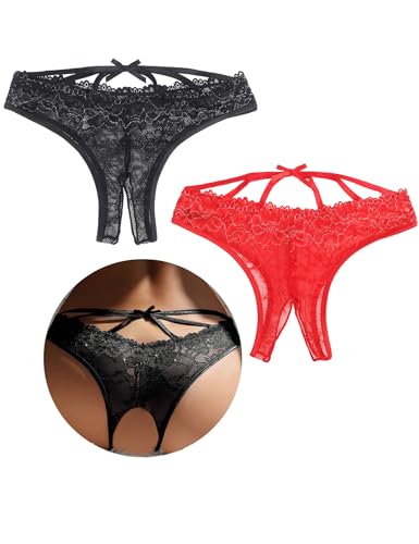 comeondear Culotte Fendue String Ouvert Femme Sexy Chic Tanga Dentelle Grande Taille Slip Bresilien Respirante sous-vêtements Féminins Lingerie Stretch Underwear Thongs Lot de 2 2-Noir+Rouge,S