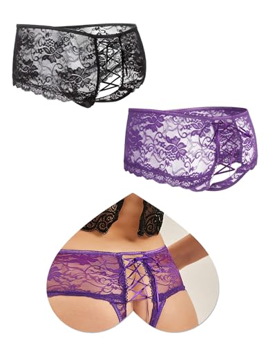 ohyeahlady Culotte Fendue à L'Entre Jambe Grande Taille String Ficelle Ouvert Femme String Femme Sexy Chic Hot Dentelle Tanga Coton sans Couture Lingerie Dentelle sous Vetements(XXL,Noir+Violet)