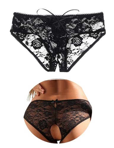 comeondear String Ouvert Femme Sexy Hot sous-vêtements Grande Taille Tanga Lingerie Érotique Dentelle Culotte Fendue Shorty Noir Slip Stretch 1-Noir,XS-S