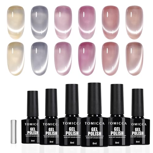 TOMICCA Cat Eye Gel Nail Polish, 6 Couleurs Argent Nude Rose Violet Clair Verre Cristal Pailleté Vernis Semi Permanent Magnétique Soak Off UV/LED Pour Nail Studio & DIY Home, 8ml