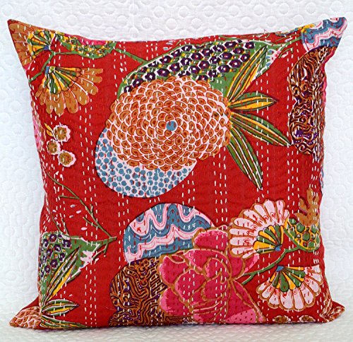 Housse de coussin décorative chic faite à la main en coton Kantha de style bohème et hippie (rouge, 40,6 x 40,6 cm)