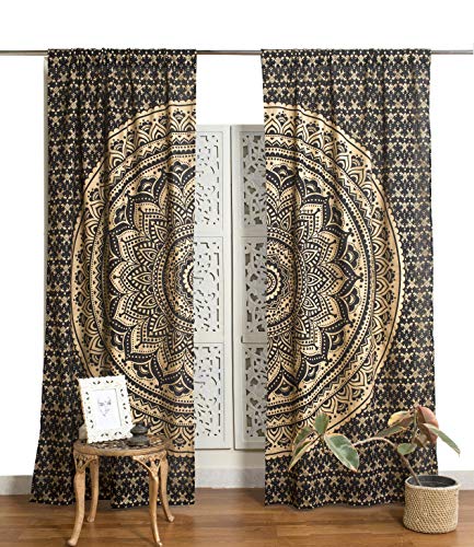 Popular Handicrafts Rideaux bohèmes ombrés à Motif Mandala - Style Indien Hippie - Noir et doré