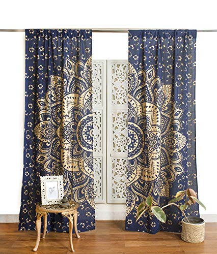 Popular Handicrafts Rideaux bohèmes à Motif Mandala - Style Indien Hippie - Ombré (Bleu et doré)
