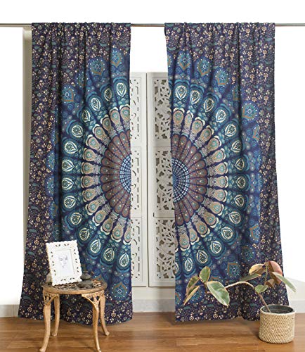 Popular Handicrafts Rideaux imprimés Style Indien Hippie bohème à Motif Mandala et Paon Bleu Turquoise