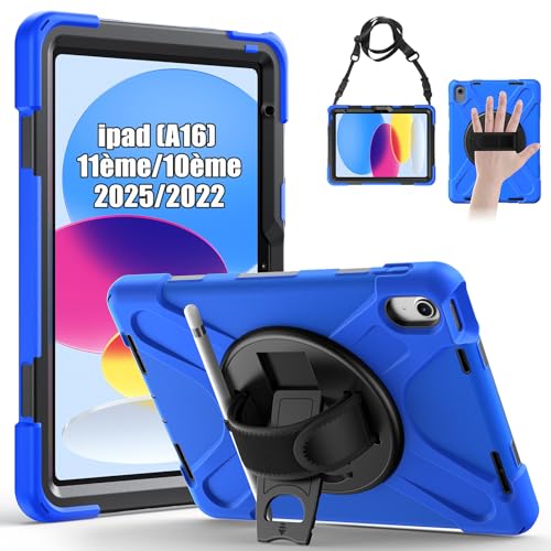 Gerutek Coque Antichoc pour iPad 11ème 2025 (A16)/10ème Génération 2022, (11/10.9 Pouces), Étui Robuste avec Support Rotatif à 360°, Dragonne et Bandoulière, Porte-Stylet, Coque pour iPad 11ème, Bleu