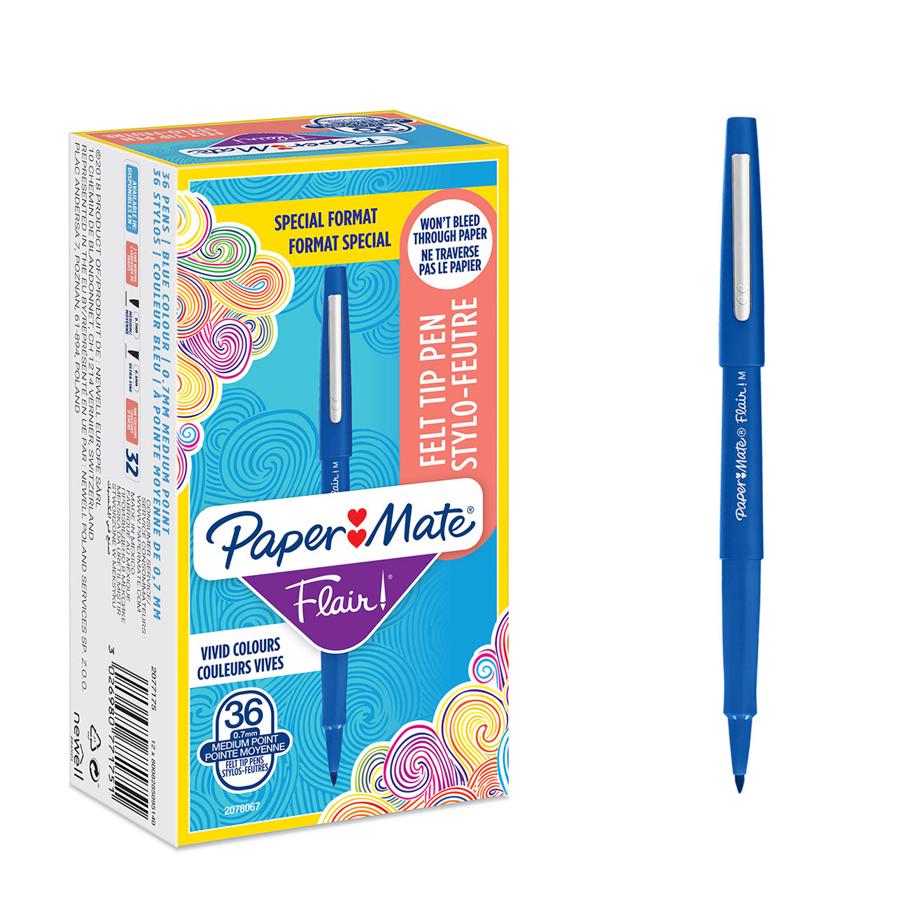 Paper Mate Flair Original Stylo feutre à capuchon pointe moyenne 1 mm - Bleu - Pack de 30 + 6 OFFERTS