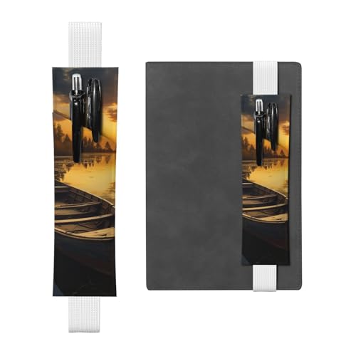 JHLMN Porte-stylo pour carnet de notes avec bande élastique réglable - Porte-crayon - Coucher de soleil sur la rivière - Bateau en bois - Marque-page - Pochette en cuir synthétique - Pochette à
