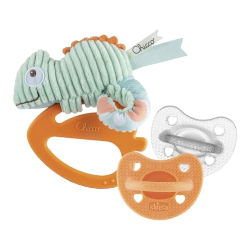 Chicco anneau de dentition et 2 sucettes Luxe 6-16 mois, anneau de dentition pour nouveau-né, anneau caméléon, plastique souple, sucette PhysioForma Luxe, sucettes en silicone douces et délicates