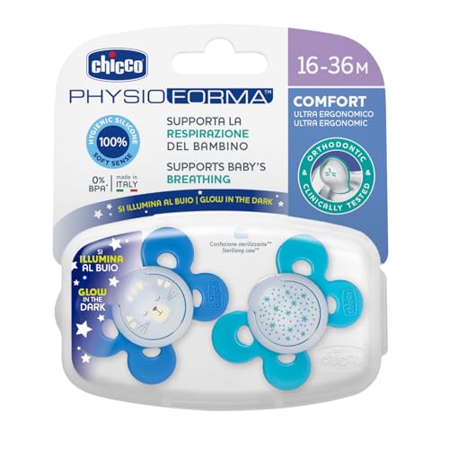 Chicco Sucette Physio Forma Air Bleu, sucette 16-36 mois, phosphorescente, tétine en silicone, anatomique et fonctionnelle, favorise la respiration physiologique, bleu, 2 pièces