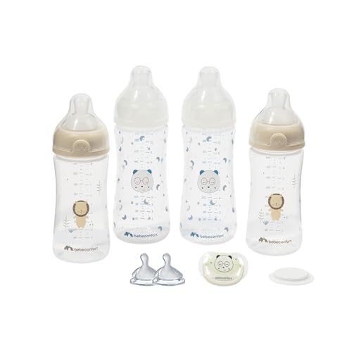 Bebeconfort Kit Biberons Anti Colique Physio Air Grow-with-Me, 0+ mois, Comprend 4 Biberons Nouveau-né, 3 Tailles de Tétines, Sucette de Forme Physiologique, Conception phosphorescente