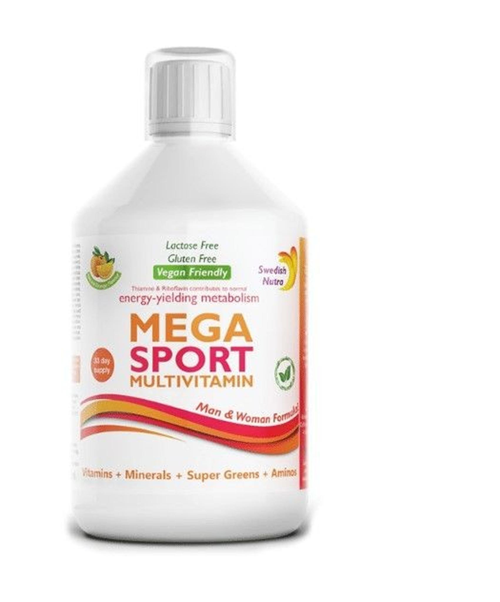 Swedish Nutra® Mega Sport - formule liquide puissante pour les personnes actives - vitamines, minéraux, super greens - pour le sport - au goût d'orange
