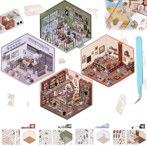 enseak 4 Set DIY 3D House Stickers,3D House Sticker Set,Sticker 3D House for Kids,3D Sticker Scenes Book,Fun DIY Stickers Scene Make Your Own Supermarket/Coffee Shop/Restaurant/Bookstore Adult Kids