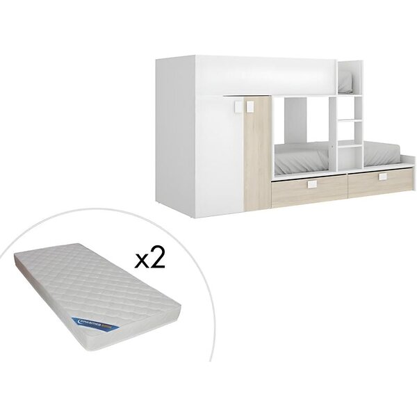 Vente Unique Lits Superposés 2 x 90 x 190 cm Armoire intégrée Blanc et naturel matelas JUANITO