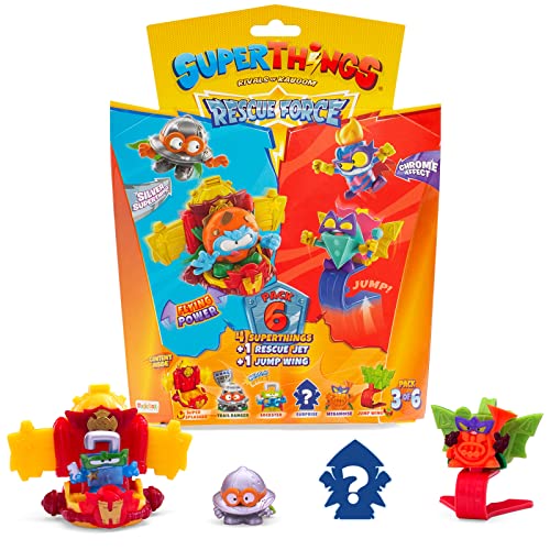 Rivals of Kaboom 8431618019597 Superthings Série Rescue Force, ce Pack Comprend 4 Figurines à Collectionner (1 Capitaine argenté Surprise et Un SuperThing avec Effet chromé) + 1 Rescue Jet et 1 Jump