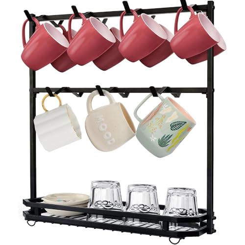 Niciksty Porte-Tasses à Café à 2 Niveaux avec 14 Crochets, Porte Tasse avec Base de Rangement, Support de Tasse à café pour Comptoir, pour Cuisine ou Bar à Thé/Café