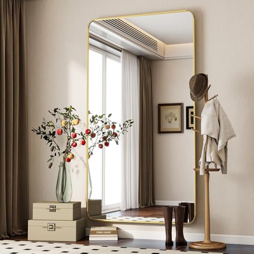 Koonmi Miroir Pleine Longueur - 150 x 40 cm - Rectangulaire - Angle Rond - avec Support - Cadre en Alliage d'aluminium - Verre trempé - pour Chambre à Coucher, Salon, vestiaire, doré