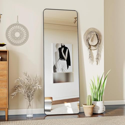 Koonmi Miroir Pleine Longueur - 150 x 40 cm - Rectangulaire - Angle Rond - avec Support - Cadre en Alliage d'aluminium - Verre trempé - pour Chambre à Coucher, Salon, vestiaire - Noir