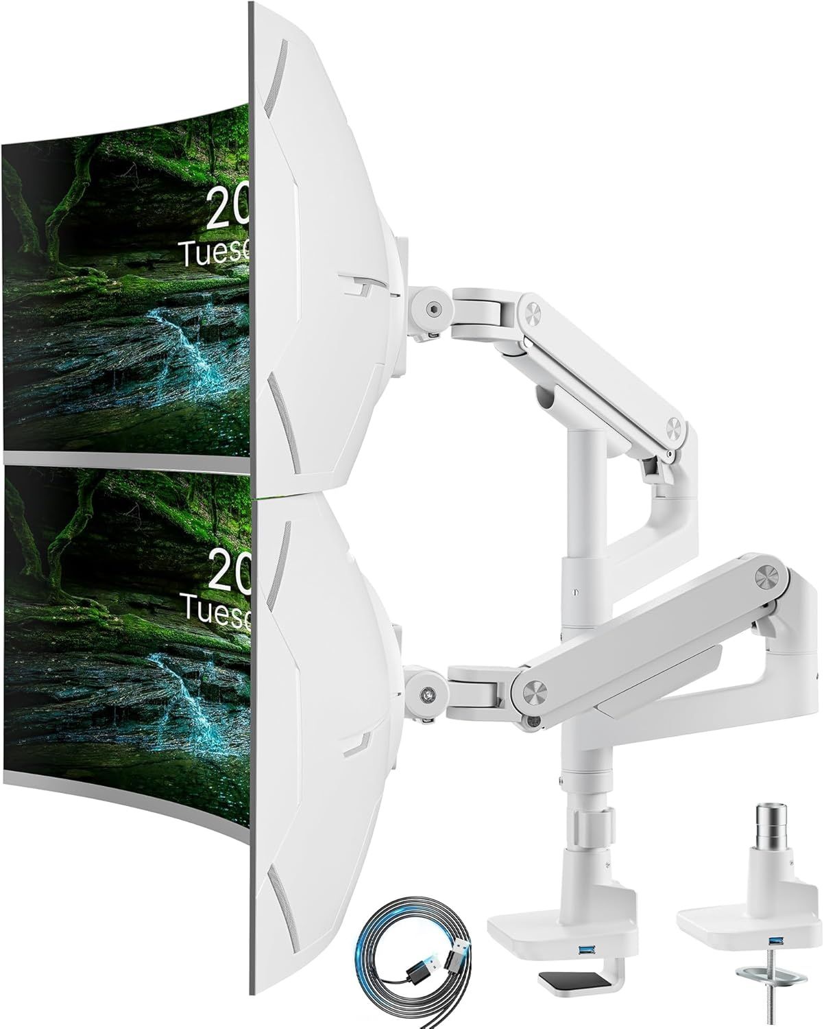 ARES WING Support Double Écran PC pour Moniteurs 17-49 Pouces, Support d'écran PC réglable en Hauteur avec Câble d'extension USB, Pivot et Rotation, Charge Maximale 20kg,VESA 75/100 mm,Blanc