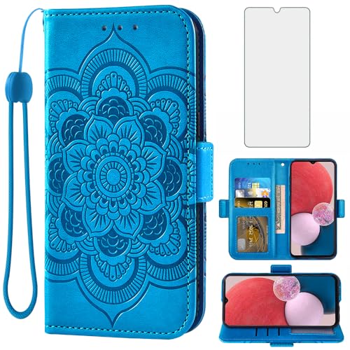 Asuwish Coque pour Samsung Galaxy A12/M12 Portefeuille avec Verre Trempé et Porte Carte Chaine PU Cuir à Clapet Mandala Étui Housse Support A 12 4G 5G à 12A Protege Ecran Téléphone Case Femme Bleu