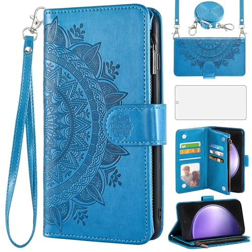 Asuwish Coque pour Samsung Galaxy S23 FE 5G Portefeuille avec Verre Trempé et Cordon Porte Carte Chaine PU Cuir à Clapet Ecran Mandala Étui Housse Support S 23 S23FE 23FE Téléphone Case Femme Bleu