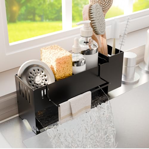 BRYN Porte Eponge evier Cuisine, Acier Carbone Support Eponge evier Cuisine, Range Eponge evier avec Porte-Serviettes, Organisateur evier Cuisine pour Brosse, Savon à Vaisselle, Salle de Bain (Noir)