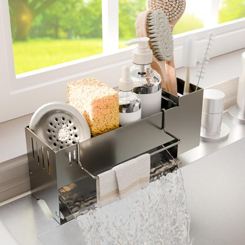 jiuzcare Organisateur D'évier Porte Eponge Evier Cuisine Support Eponge Evier Cuisine INOX avec Séparateur Amovible Porte Eponge avec Porte-Serviettes