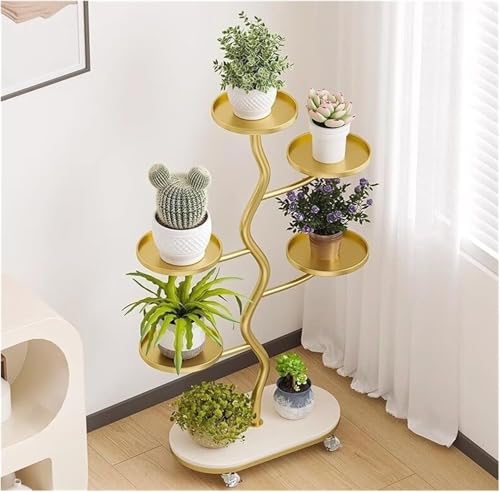 Porte Plante Interieur - Support Fer Forgé, Étagère Métallique De 6 Niveaux Escalier, Tabouret avec Roues, pour Plantes Fleurs Idéal pour Maison Balcon Jardin(Gold)