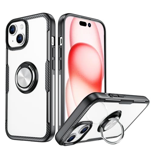 SORAKA Coque Transparent pour iPhone 15 avec Anneau et Plaque métallique pour Support Téléphone Voiture Magnétique,Transparent Hard Etui+Pare-Chocs Silicone