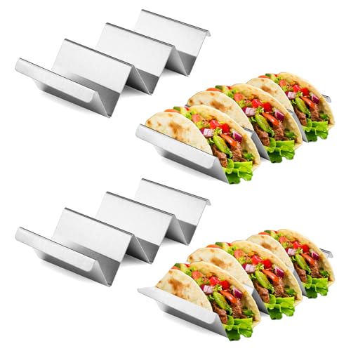 qhklew Support à Tacos, Porte Tacos, Support à Tacos en Acier Inoxydable avec Poignées, pour Contenir des Tacos des Sandwichs, des Hot Dogs et des Crêpes, Passe au Four et Micro Onde (4 Pièces)