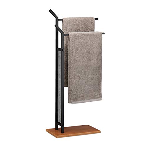 Relaxdays, noir Porte pied, Support pour serviettes de bain 2 barres, bambou, métal, 85,5x45x22,5 cm, 5 x 45 x 22,5 cm