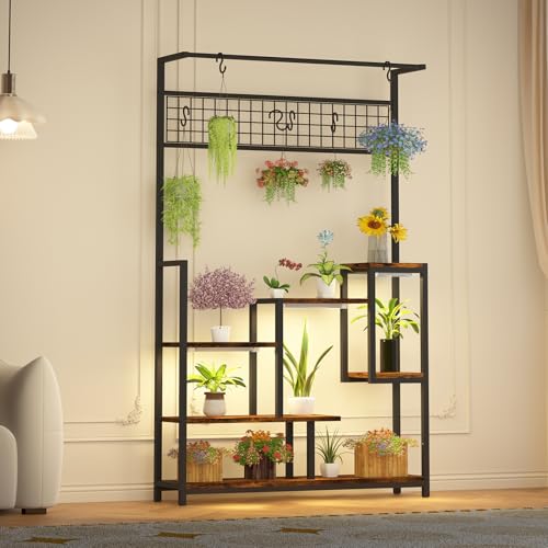GarveeLife Support Plantes Intérieur 7 Étagères Avec éclairage LED De Croissance, Avec Grille Et Crochets, Étagère à Fleur En Bois Et En Métal, Idéal Pour Balcon, Salon, 78x24x180CM(Marron)