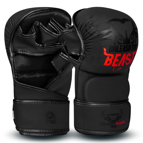 BEAST RAGE MMA Gants pour Hommes et Femmes, Support de Poignet Ajustable, Paume Ouverte, Gants d'arts Martiaux pour Muay Thai, Combat en Cage, Taekwondo (Noir, S/M)