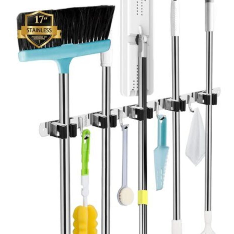 Piyl Support mural pour balai et serpillère – 5 supports et 4 crochets pour balais – Organiseur de serpillère en acier inoxydable robuste pour la maison, la cuisine, le jardin, la buanderie, le