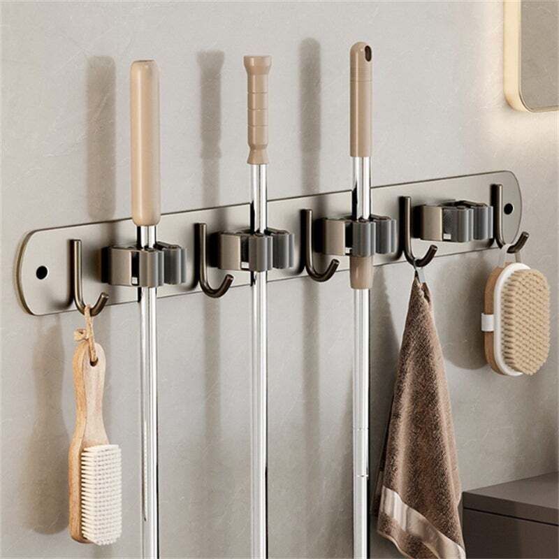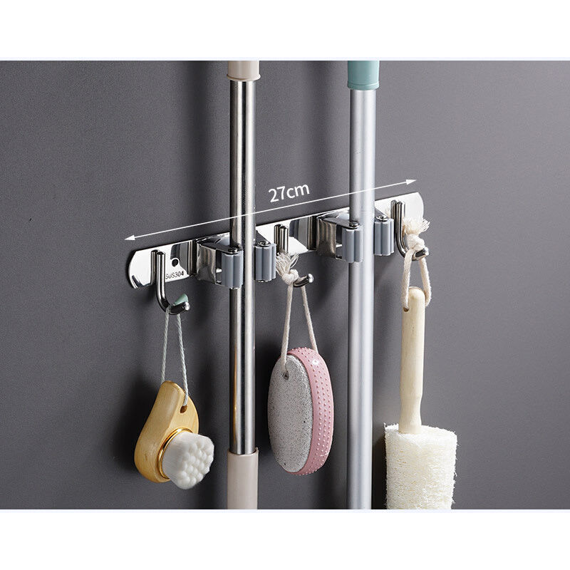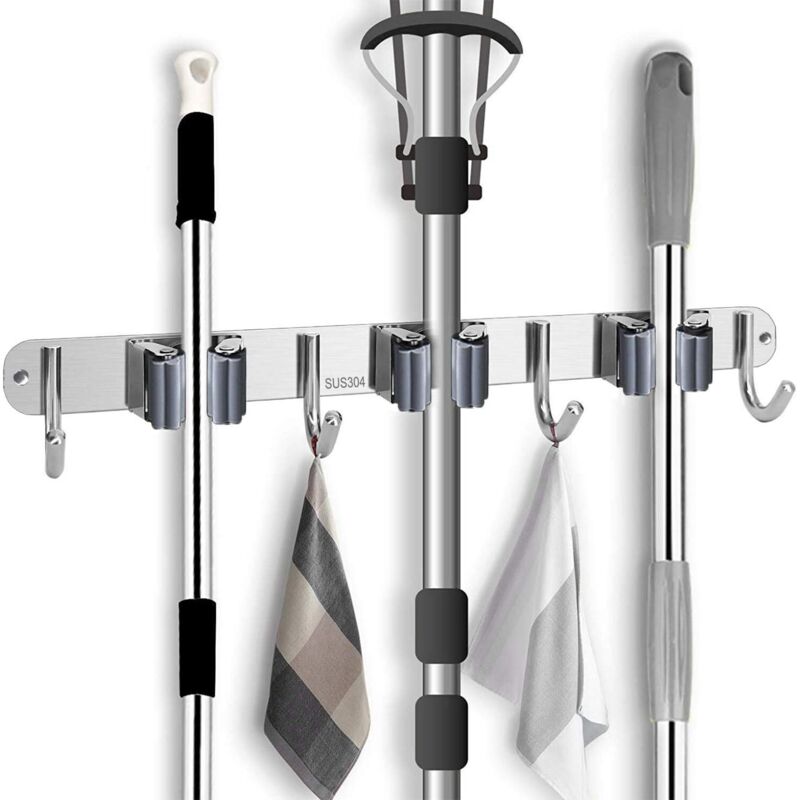 Support mural pour balai à franges en acier inoxydable avec 3 clips et 4 crochets pour cuisine, jardin, balcon et garage.