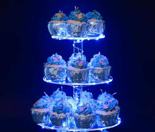 Ulifeme 3 Etages Présentoir Cupcake, Support à Cupcakes avec Guirlande Lumineuse à LED Bleu, Presentoir Gateau Rond pour Anniversaire, Mariage, Remise de Diplômes, Anniversaire, Décoration de FêteE