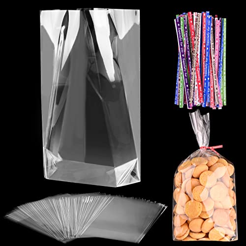 100 Pièces Sachet Bonbon Transparents 20 x 30 cm Sachets Transparents pour Biscuits avec 100 Cravates Torsadées Colorées Sachet Plastique Plat pour Cadeaux Bonbon Biscuit Gateau Savon Jouets