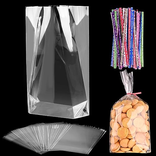 100 Pièces Sachet Bonbon Transparents 15 x 25 cm Sachets Transparents pour Biscuits avec 100 Cravates Torsadées Colorées Sachet Plastique Plat pour Cadeaux Bonbon Biscuit Gateau Savon Jouets