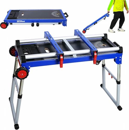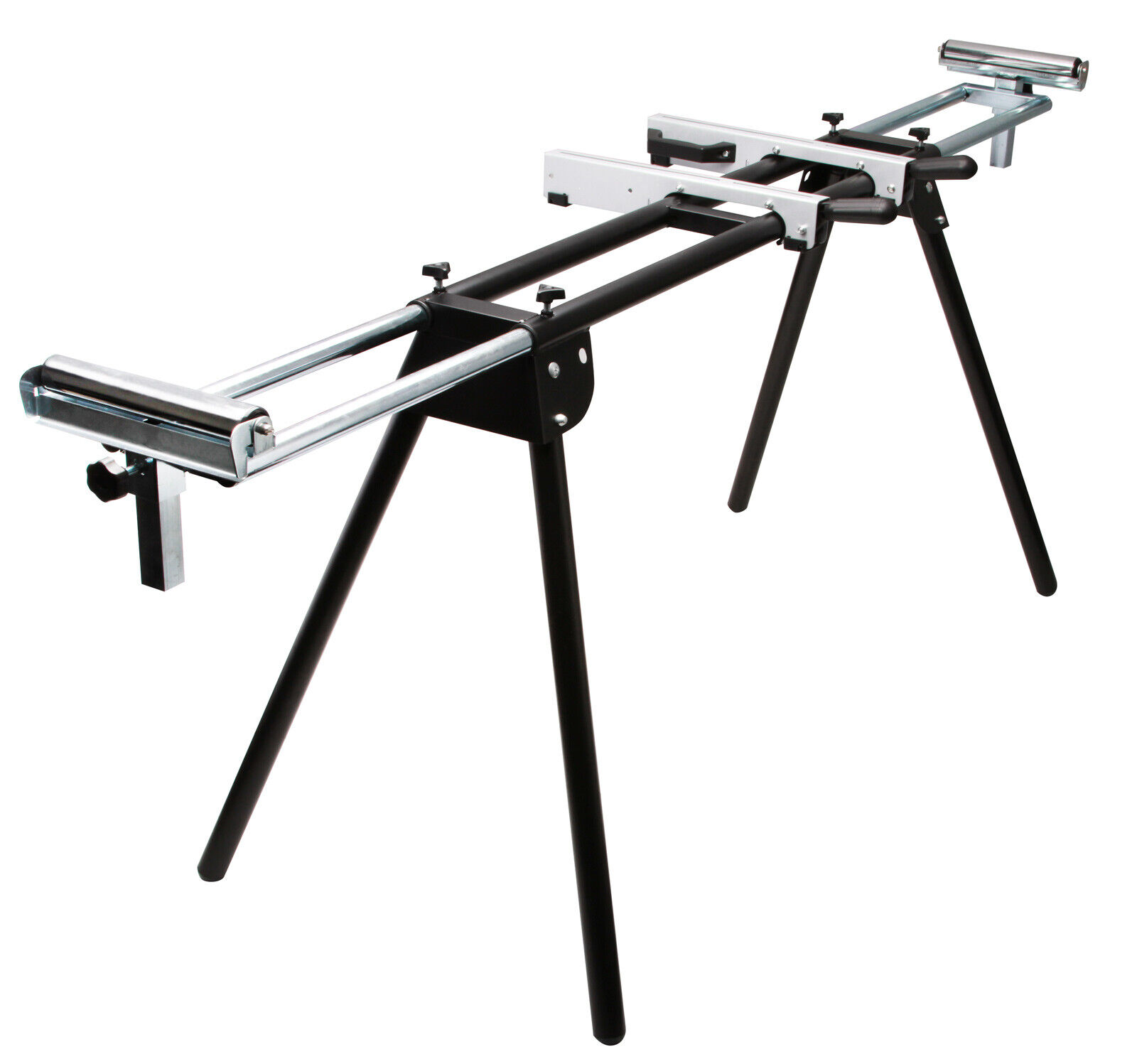 Support pour scie à onglet avec tablette - charge max. 150 kg - réglable en hauteur et sur roulettes